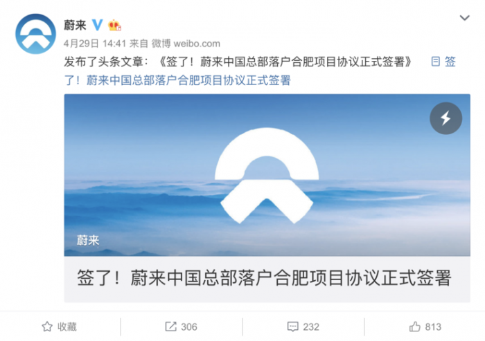 4月29 日下午,蔚来与合肥市建设投资控股(集团)有限公司、国投招商投资管理有限公司以及安徽省高新技术产业投资有限公司等战略投资者签署关于投资蔚来中国的最终协议,并与合肥经济技术开发区就蔚来中国总部入驻达成协议。