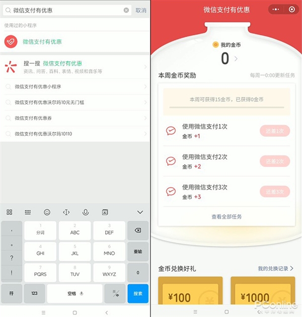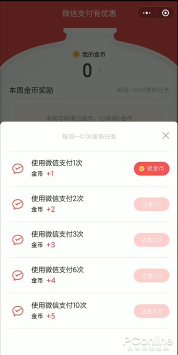 界面已经把功能基本说得差不多了,简单点说,只要我们完成几次简单的任务(其实就是使用微信支付,这个……应该没难度吧~),就能兑换相应数量的金币。