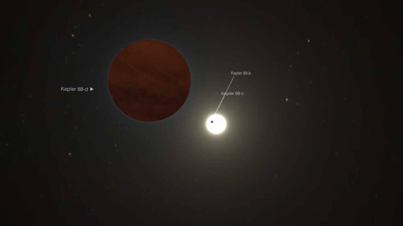 目前,开普勒88系统已经成为研究重点,在那里发现的另外两颗行星被称为开普勒88 b和开普勒88 c。这些行星以奇异的动力学而著称,这种运动称为平均运动共振。开普勒88 b小于海王星,绕恒星运行仅需11天,开普勒88 c质量和木星质量大致相同,绕恒星运行需要22天。