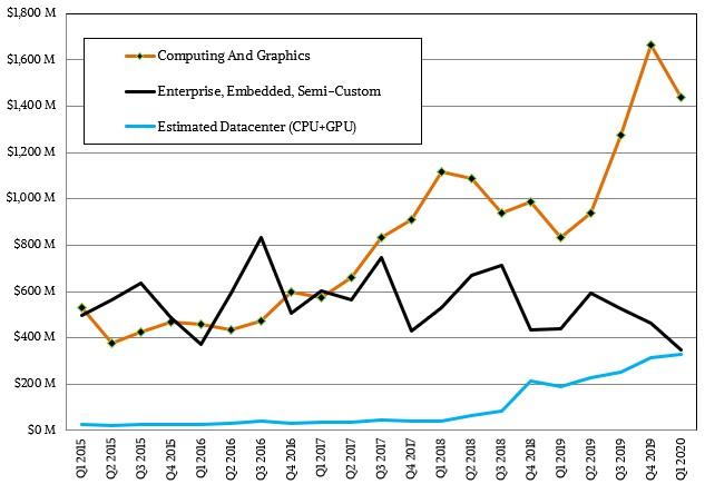 根据精简数据,过去的趋势和预测,我们认为Epyc CPU在一季度带来了2.52亿美元的销售额,比去年同期增长了2.2倍,比上一季度增长了9%,这不可思议。我们认为数据中心GPU的销售额(包括计算和图形部门制造的Radeon和Radeon Instinct卡)在第一季度达到了7800万美元,同比增长了一点,比2019年第四季度下降了一点点。