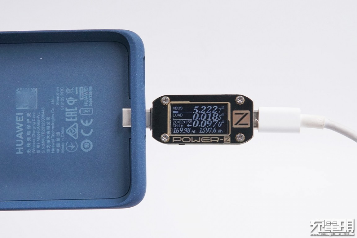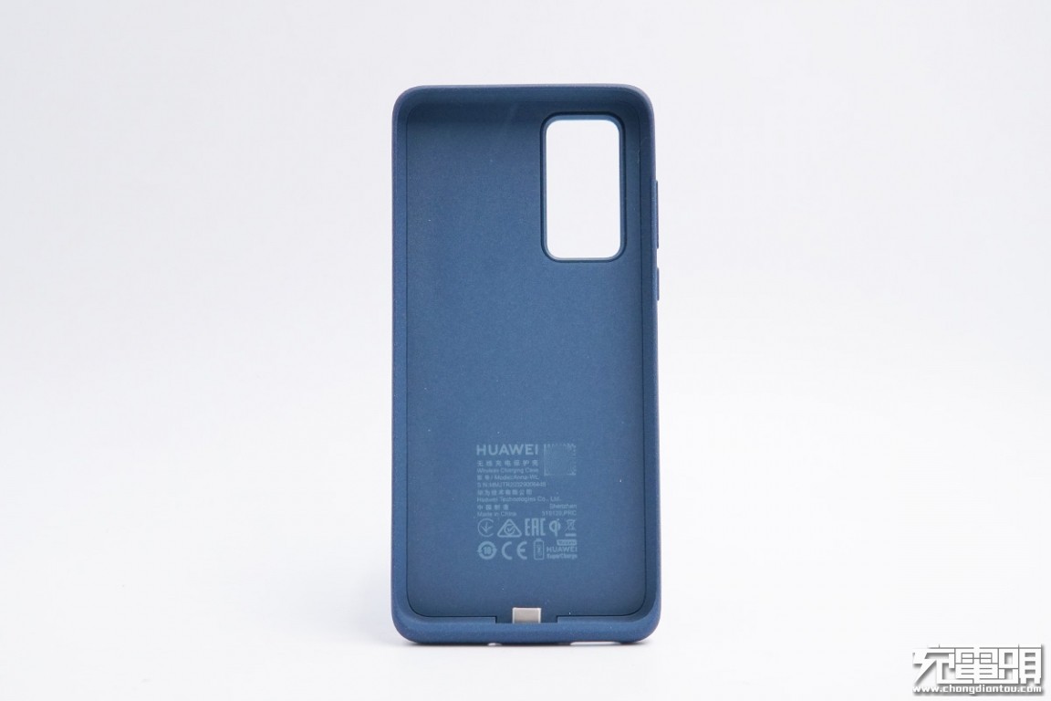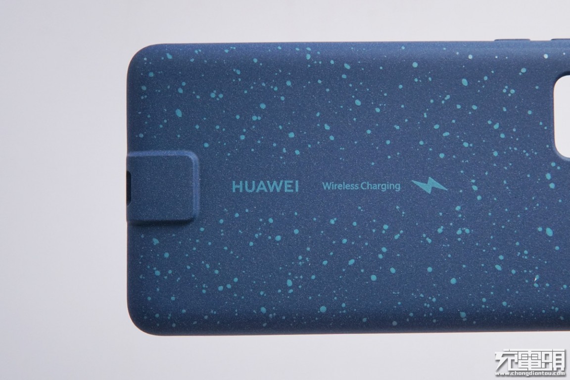 保护壳中轴线印有HUAWEI的logo以及Wireless Charging字样。靠近输入接口位置略微凸起。