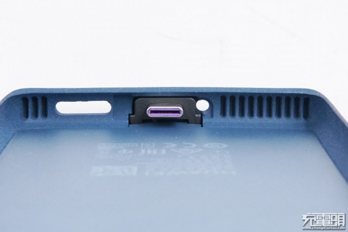 保护壳底部设有一个USB-C接口,紫色胶芯。