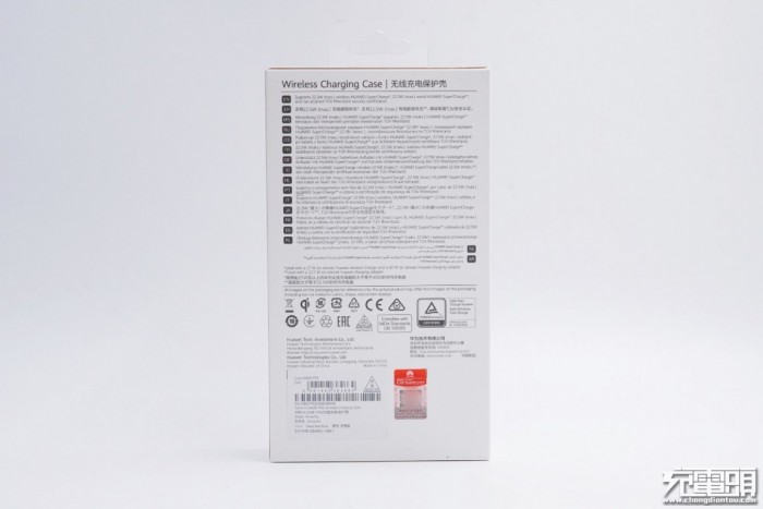包装盒背面使用了多国文字阐述了这款产品的主要卖点,并提示用户这款产品需要搭配27W以上的华为无线充电器和40W以上的华为充电器才能实现22.5W超级快充无线充电功能。