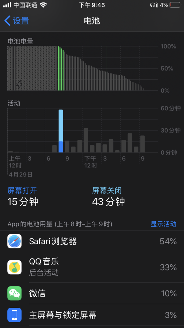 从早晨7点40起床,出门上班,途中主要是听听音乐和刷刷网页、微博,中午看看视频,下班之前看到电量低于20%,吓得我都不敢听音乐了,微信一直后台,而且大部分时间还开了深色模式,我觉得非常克制了。