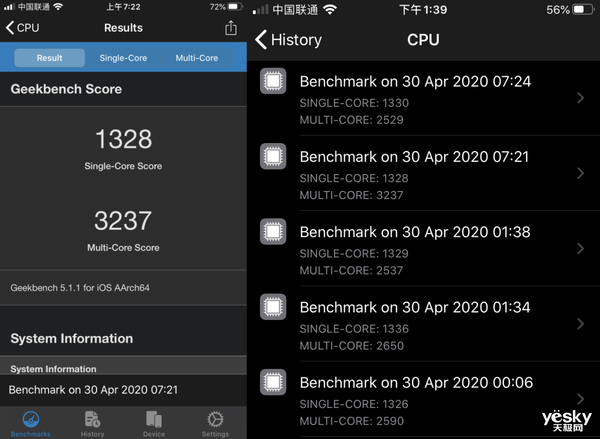然后我又换了GeekBench 5进行了测试,最高一次单核为1328,多核为3237,与iPhone 11系列接近。