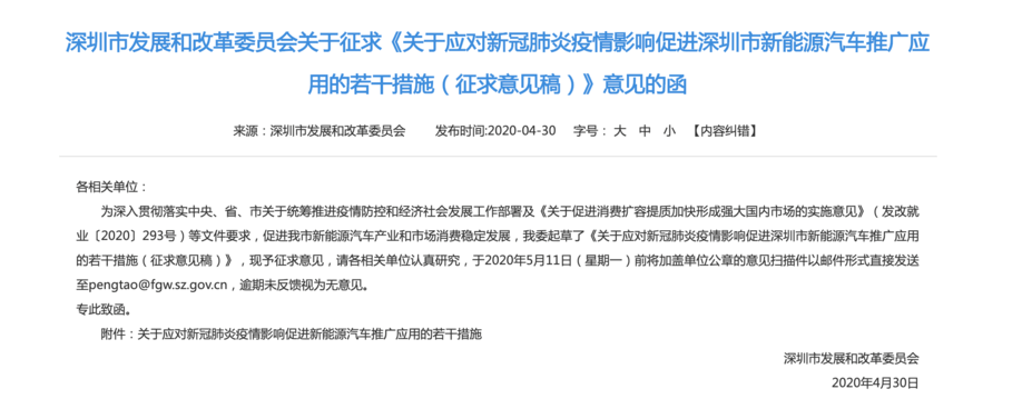 为进一步推动深圳市新能源汽车推广应用,促进新能源汽车市场消费,4月30日,深圳市发改委发布《关于应对新冠肺炎疫情影响促进深圳市新能源汽车推广应用的若干措施(征求意见稿)》。