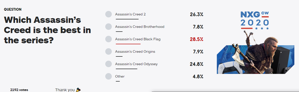 目前投票结果显示为,《刺客信条4:黑旗》票数最高,截止到发稿时,得票率为29.6%。其次是《刺客信条2》,得票率为26.2%,再然后是《刺客信条:奥德赛》,得票为24.6%。《刺客信条:起源》和《刺客信条:兄弟会》得票率相对比较低,只有8%左右。