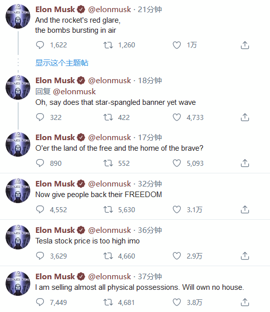 在马斯克发布这一消息以后的半个小时里,特斯拉股价大跌近12%。他还发布了其他几条Twitter消息,内容包括倡导“还人们以自由”、美国国歌的歌词和诗人迪伦·托马斯(Dylan Thomas)的诗句等,还称其将会售所有财产。