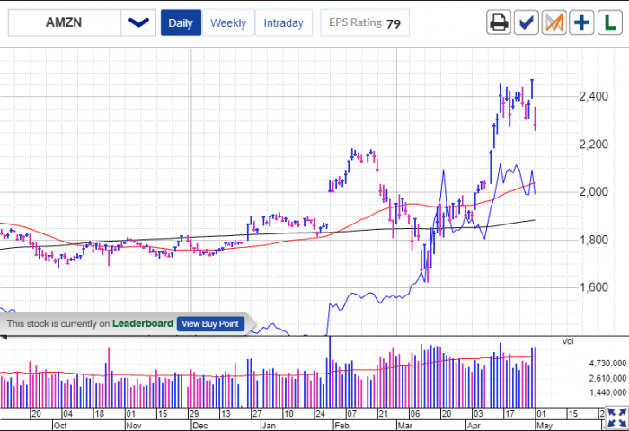 尽管第一季度业绩喜忧参半,星期五华尔街分析师仍然上调了亚马逊目标股价。今天常规交易中,亚马逊股价下跌187.96美元,跌幅为7.6%,报收于2286.04美元。虽然今天下跌,亚马逊股价仍然比2186.5美元的买入点高出约5%。昨天亚马逊股价创下新高,目前仍然处于上限为2295.35美元的买入区内。虽然亚马逊CEO杰夫·贝佐斯(Jeff Bezos)表示第二季度经营费用将因新冠疫情增长约40亿美元,但分析师似乎并不在意。FBN证券分析师谢比利·塞拉菲(Shebly Seyrafi)发表投资报告中称,“我们认为,亚马逊是终极的居家隔离股。”他维持对亚马逊股票的“跑赢大盘”评级,并将目标股价由2200美元上调至2550美元。多名华尔街分析师把亚马逊目标股价定在2550至3000美元之间。Monness Crespi, Hardt分析师布赖恩·怀特(Brian White)发表投资报告称,“疫情期间,亚马逊证明自己在向全国消费者提供日用品方面是不可或缺的,用户数量将进一步增加,危机过后其业务会更强大。”他维持对亚马逊股票“买入”评级,并把目标股价由2650美元上调至2800美元。