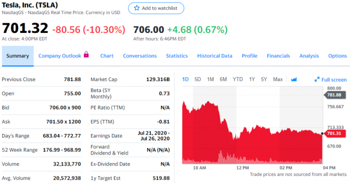 特斯拉CEO埃隆·马斯克(Elon Musk)星期五发布多条推文,称公司股价“太高”了,特斯拉股价应声下跌。今天常规交易中,特斯拉股价下跌80.56美元,跌幅为10.3%,报收于701.32美元,盘中一度探底683.04美元。在马斯克发布推文前,特斯拉市值约为1410亿美元,收盘后市值缩水至1290亿美元。马斯克个人资产也蒸发约30亿美元。过去12个月,特斯拉股价累计上涨202%,过去3个月累计涨幅接近35%,而过去12个月标普500指数累计下跌近10%,过去3个月上涨10%。马斯克还再次呼吁重新开放经济。Wedbush证券分析师丹·艾维斯(Dan Ives)在一封电子邮件中称,“我们认为这些说法带有玩笑成分,具有典型的马斯克风格,但这肯定会给投资者造成麻烦。”马斯克向《华尔街日报》表示,他不是在开玩笑,但也没有仔细检查自己的推文。马斯克2017年5月就曾表示,500亿美元的市值超过公司应有水平。