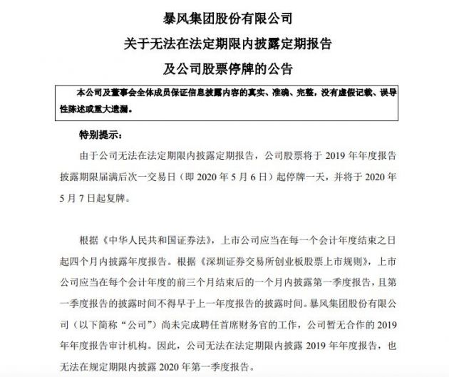 暴风集团:因无法在法定期限内披露定期报告 股票5月6日起停牌一天