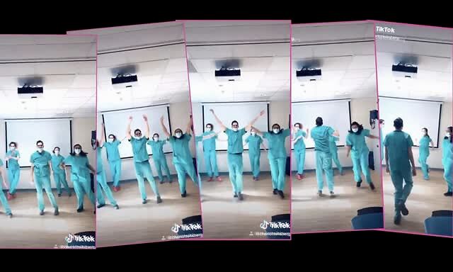也有一些和疫情直接相关的视频。比如,一个人的父亲奄奄一息。有人在空无一人的病房里跳舞。还有下图,一群护士在跳舞: