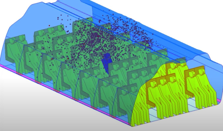 而这段最新视频显示了当有人在飞机机舱内咳嗽会发生什么。这个模拟是由普渡大学机械工程学院进行的。这是该校2014年为波音公司进行的一项研究的一部分,研究的是飞机的通风系统潜在的气流变化,可以降低像SARS这样的传染病的感染风险。