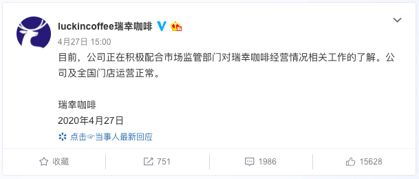 后来的事实证明,监管层面的表态已经转化成实际行动。到了 4 月 27 日,有媒体报道称,证监会派出调查组进入瑞幸,同时公安、工商等介入,高管被查,资料上交。对此,瑞幸官方当天的回应是: