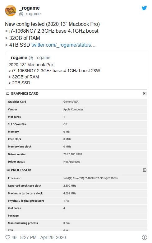 推友@_rogame周三在Twitter上发布消息称,2020年的13英寸MacBook Pro会带来新的配置,首先是配备酷睿i7-1068NG7四核处理器,时钟频率为2.3GHz,睿频提升后可能达到4.1GHz,而在同一条推文中还提到该款机型还在测试配备32GB内存和4TB SSD的可能性。
