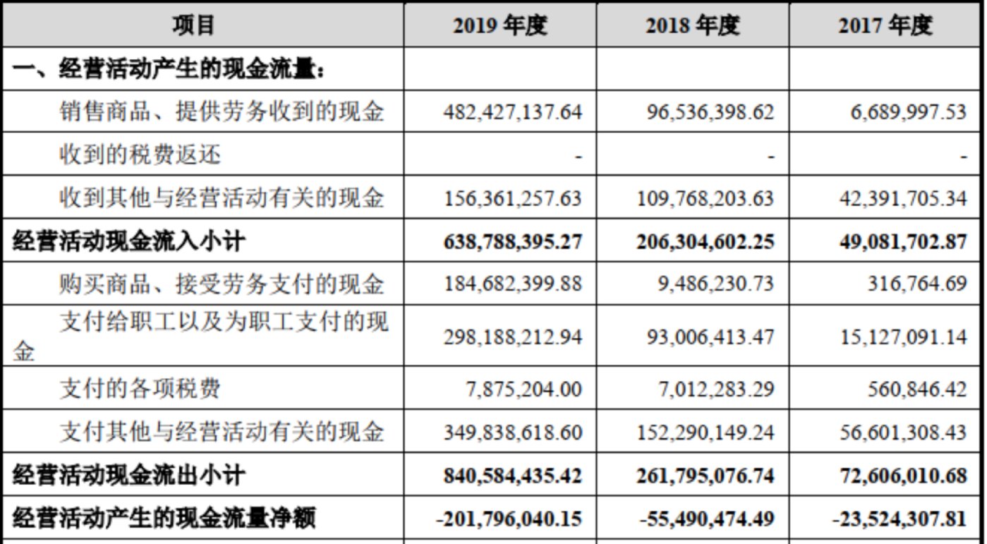 2017年、2018年和2019年,寒武纪招股书显示的亏损金额分别为3.8亿、4.1亿和11.8亿元。在财务方面,这不是一家表现良好的企业,除了亏损,在2017年至2019年三年中,寒武纪经营活动产生的现金流量净额同样为负,并在2019年从千万元级别扩大至亿元级别。