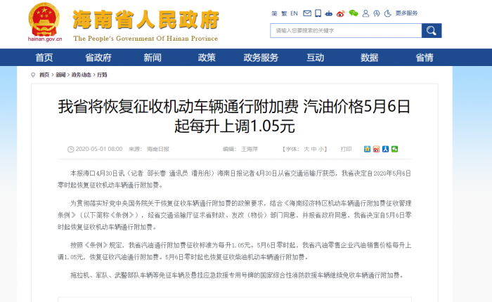 不过,近日,我们从海南省人民政府获悉,自5月6日零时起,海南省恢复征收汽油通行附加费,即省内汽油零售企业汽油销售价格上调1.05元/升。同时,5月6日零时起也恢复征收柴油机动车辆通行附加费。