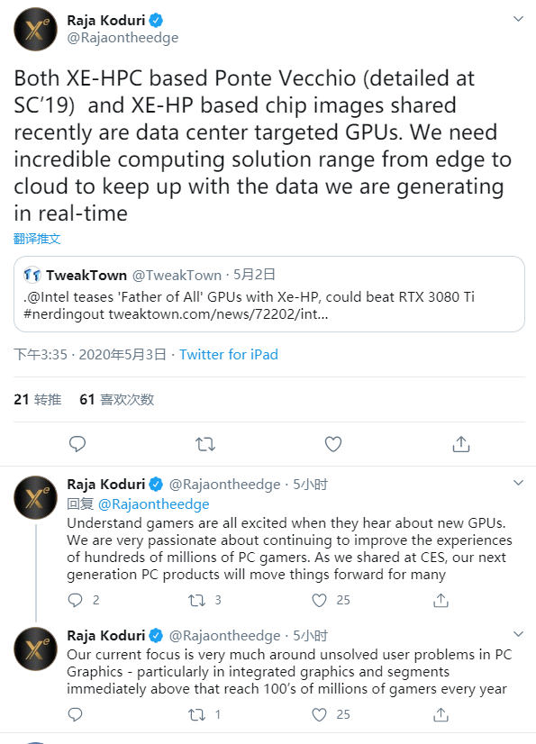 Raja Koduri连发多条推文,解释了Intel GPU的一些方向规划,其中特别强调,Xe HPC架构的Ponte Vecchio、Xe HP架构的芯片都是面向数据中心市场的,因为从边缘计算到云计算,都需要异常强大的计算资源,来处理实时产生的海量数据。