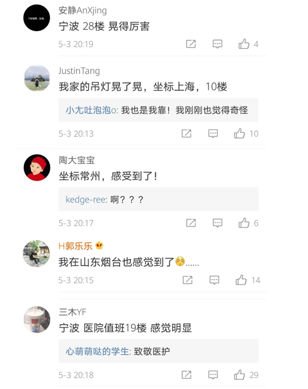 据中国地震台网正式测定:5月3日19时54分,日本九州岛附近海域发生6.0级地震,震中位置北纬31.37度、东经128.70度,震源深度10千米。本次地震发生在我国东海海域,距离本土虽然仍有很长一段距离,但由于震级较高,仍然造成江苏、浙江、上海乃至是山东等多地明显震感,尤其是位于高层建筑的。