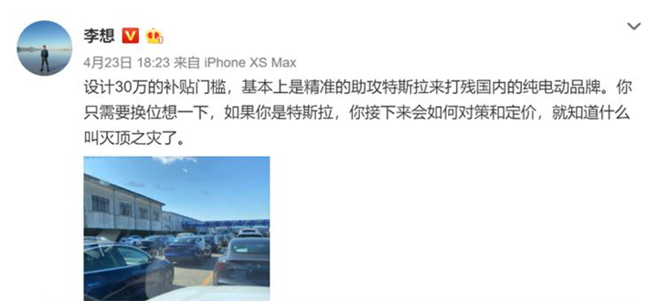 这之后的事情就热闹了。特斯拉方面,有人收到了因为政策影响需要自己补贴差价的信息。同时其它新能源大佬纷纷在微博上表态。吃瓜群众看的是一片火热。