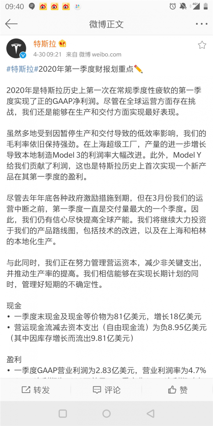 那么特斯拉自身现在是怎样一个状态呢?事实上在昨天特斯拉宣布降价预告的同时也在官方微博发布了另外一篇财报概况要点。