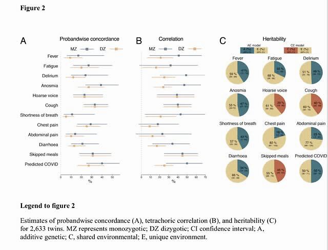 在“预测COVID-19”方面中也观察到遗传相关性:总体样本中该相关性为50%(29%-70%),近针对分开居住的双胞胎样本则显示为54%(30%-77%)。“预测COVID-19”状态是由自我报告的年龄、性别、嗅觉丧失、严重或明显的持续咳嗽、疲劳和食欲不振的线性组合来确定。