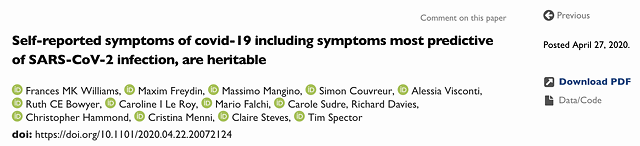 该研究团队在预印本网站medRxiv在线发表了上述研究“Self-reported symptoms of covid-19 including symptoms most predictive of SARS-CoV- 2 infection, are heritable ”,研究尚未经同行评议。