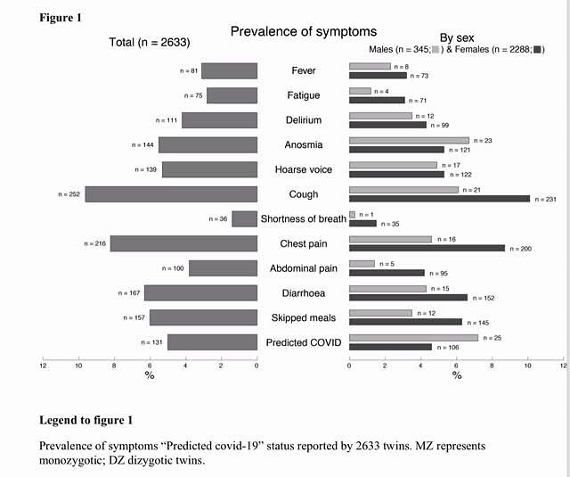 研究团队将早就启动的TwinsUK项目中报告自己当前症状的成年双胞胎纳入此次研究中。2020年3月25日至4月3日之间,2633名成年同性双胞胎提供了数据。该研究基于症状的机器学习算法,对COVID-19症状进行经典的双胞胎研究,并预测个体被感染的可能性。