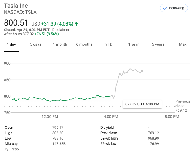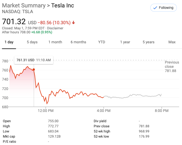 事件在一系列媒体发酵后,财报电话会议次日(4月30日,北美时间)特斯拉的股价直接暴跌近9%。