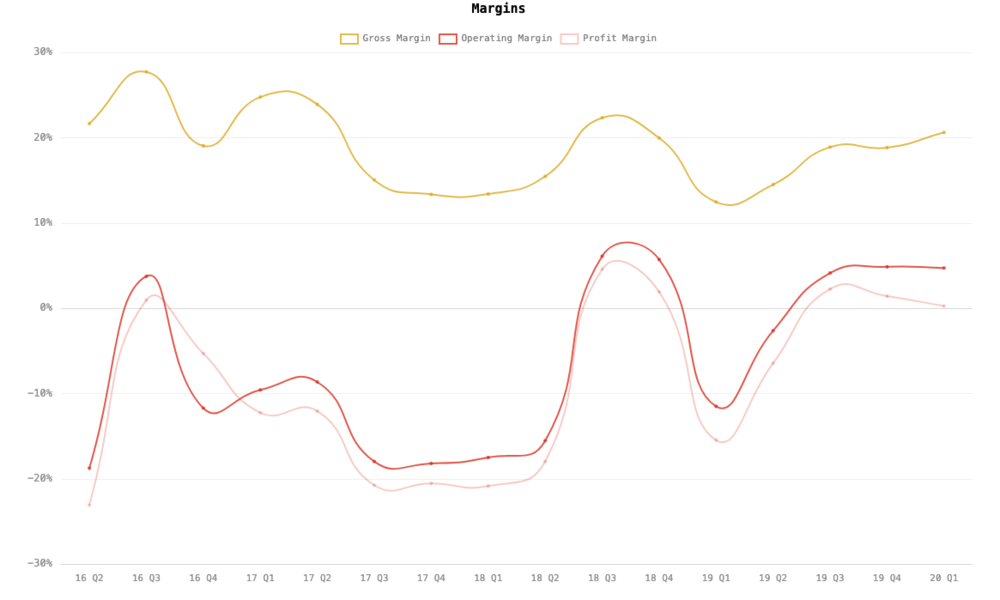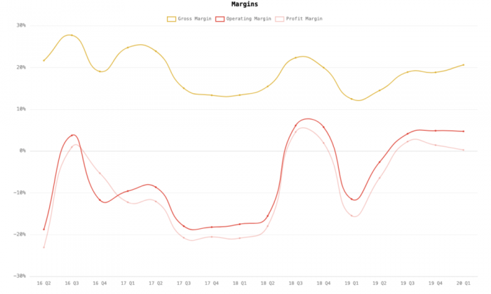 首先是特斯拉在该季度再次实现了盈利(GAAP净利润1600万美元,Non-GAAP净利润2.27亿美元),虽然环比下降了很多(意料之中),但相比于2019年Q1季度的巨额亏损(GAAP净亏损7.02亿美元,Non-GAAP净亏损4.94亿美元),结果非常不错。