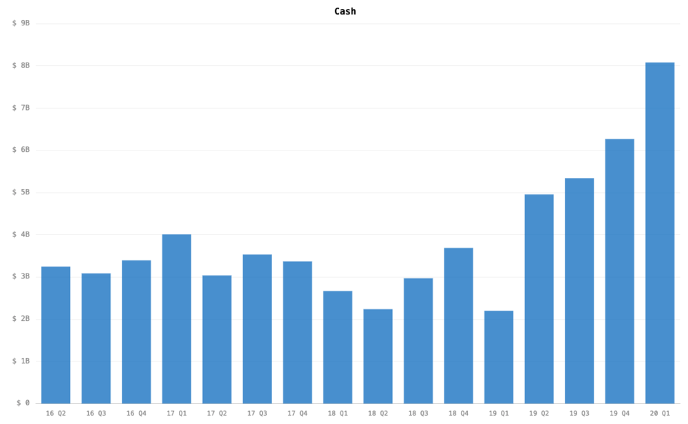 对于公司而言,现金弥足重要,不过好在特斯拉在年初进行过一次增发股票(以每股767美元的价格发行了265万股新股,共筹得23.1亿美元),现金储备增加至80.8亿美元,环比上涨29%,同比上涨268%。也就是说特斯拉目前资金储备十足,即便保持目前Q1的经营状况程度,也能撑过近9个季度。