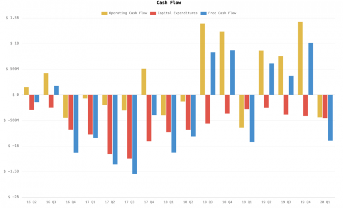 但同时因为疫情影响下,该季度生产数(102672辆,环比下降2%,同比上涨33%)大于交付数,从而使得库存增加,库存时间上涨为20天,虽然同比下降33%,但环比上涨82%。导致加上欧洲工厂建设等投资和营业花销,自由现金流减少8.95亿美元。