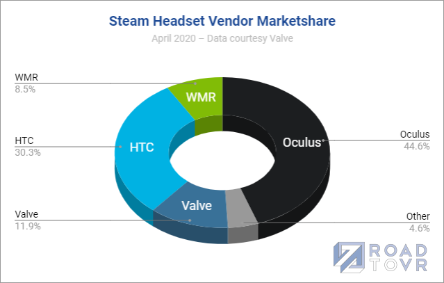 至于Steam上VR头盔各品牌占比,Road to VR的报告称目前Oculus和HTC用户最多,分别占44.6%和30.3%,而V社自家的VR头盔Index目前排第三,份额仅11.9%。