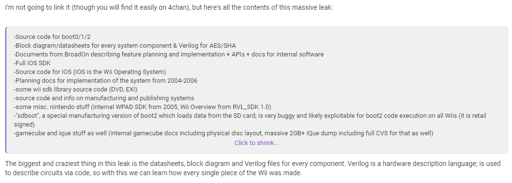 根据ResetEra论坛上的汇总,所有的数据都直接从一家和任天堂合作的公司内部窃取。BroadOn在Wii的硬件和游戏上和任天堂都有过交互合作,通过攻击BroadOn服务器黑客获得了Wii主机的所有源代码、数据表、设计框图以及每一个配件的Verilog文件(Verilog是一种硬件描述语言,通过代码文本来描述硬件结构和行为)。