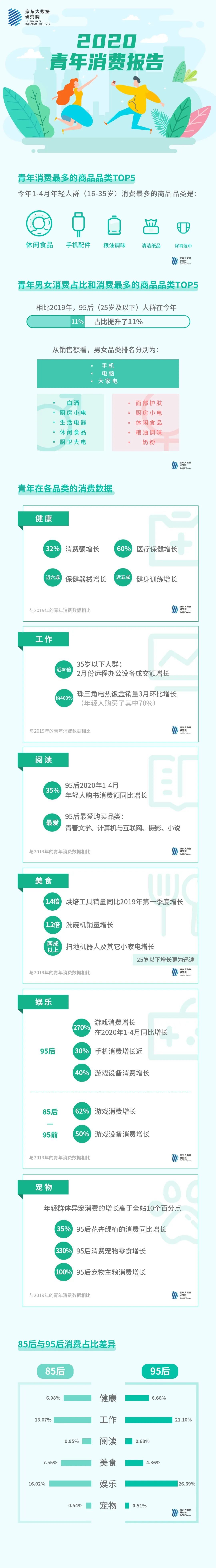 5月4日,京东发布2020青年消费报告。报告显示,疫情爆发至今,年轻人的精神追求、工作状态已到最佳。年轻人家庭责任感增强,成为家庭民生必需品的购买主力。同时,这届年轻人工作猛,也很会玩,95后更会玩。