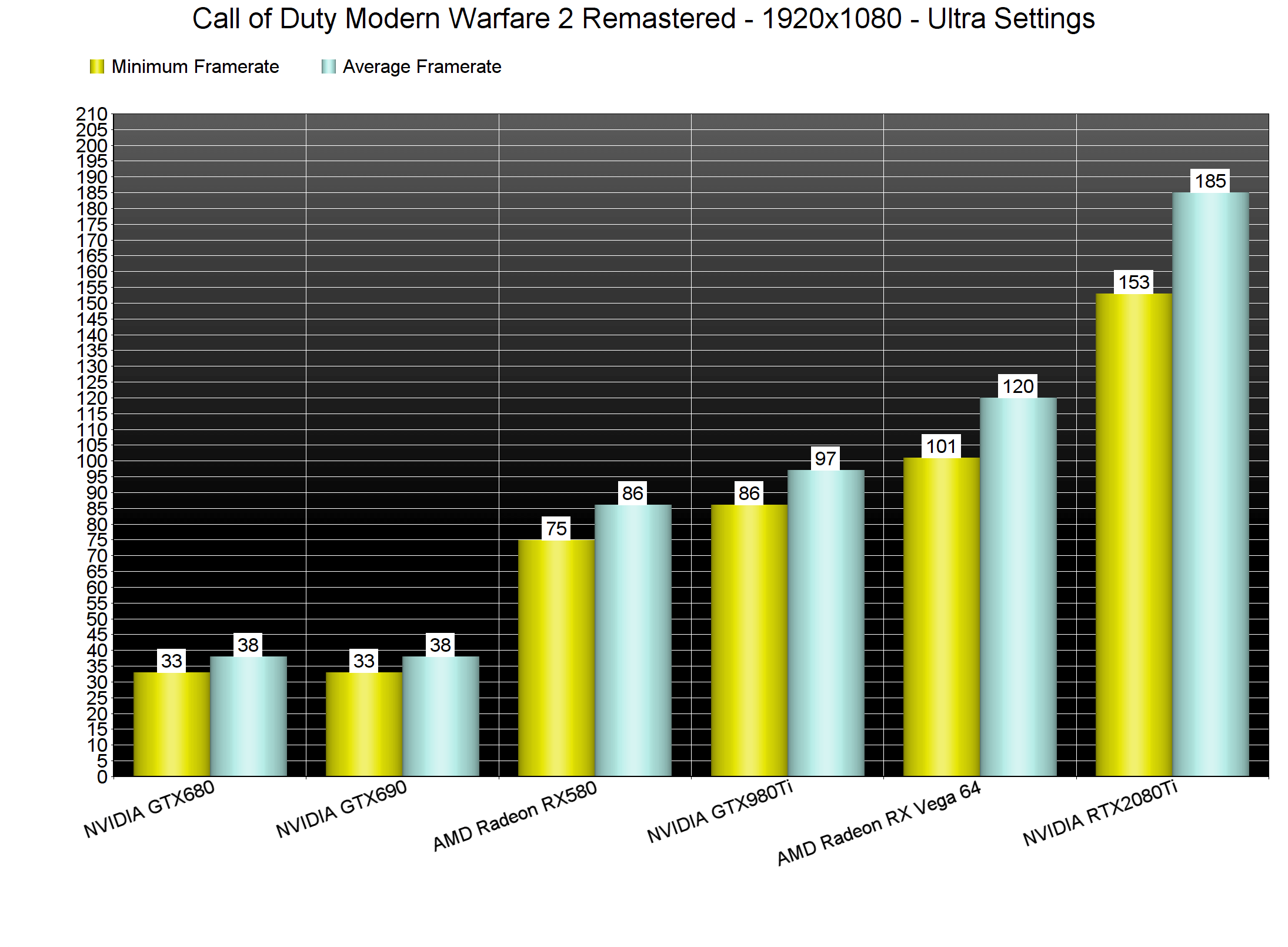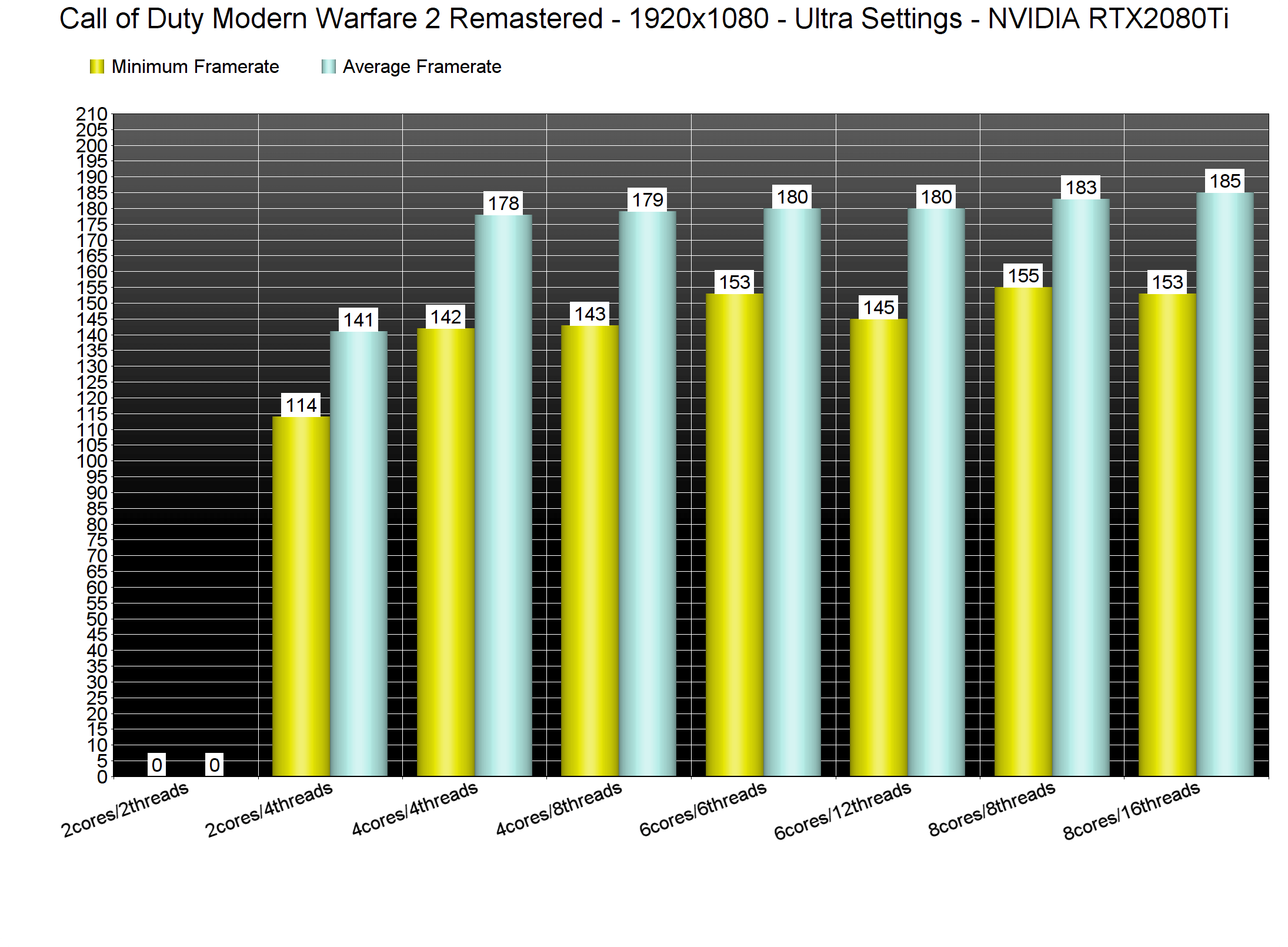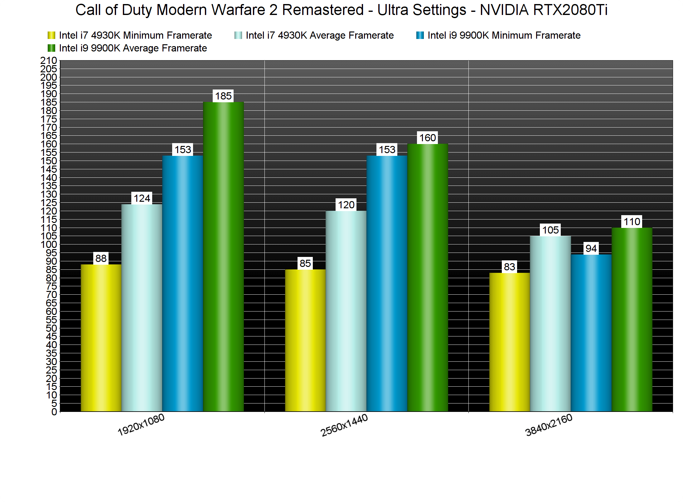 《使命召唤6:现代战争2 重制版》使用的是DirectX11 API,所以在较老的CPU上表现较差,我们的i7 4930K能够在1080p超高画质下维持60fps,但明显要比i9 9900K差一截。