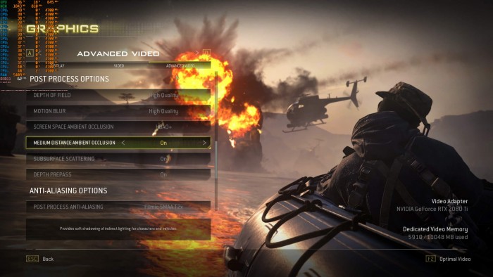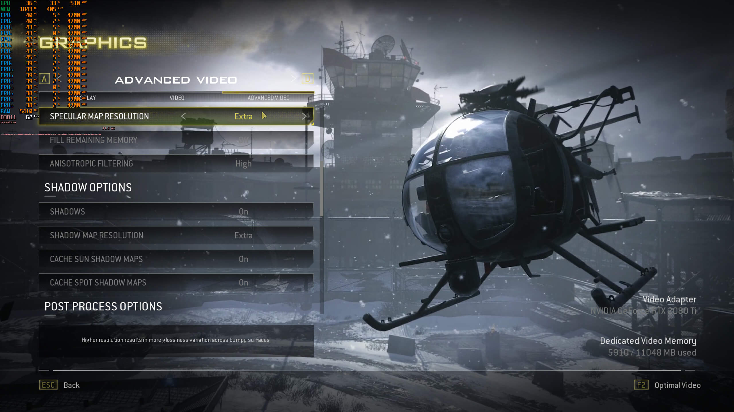 Infinity Ward和Beenox工作室为本作提供了许多画面选项,PC玩家可以调整材质质量、普通贴图、高光贴图、各向异性过滤和阴影。另外还可以开关环境光遮蔽、景深、动态模糊、亚表面散射、深度渲染等特效。另外还可以调节视野宽度、布娃娃系统、动态光照和抗锯齿效果。
