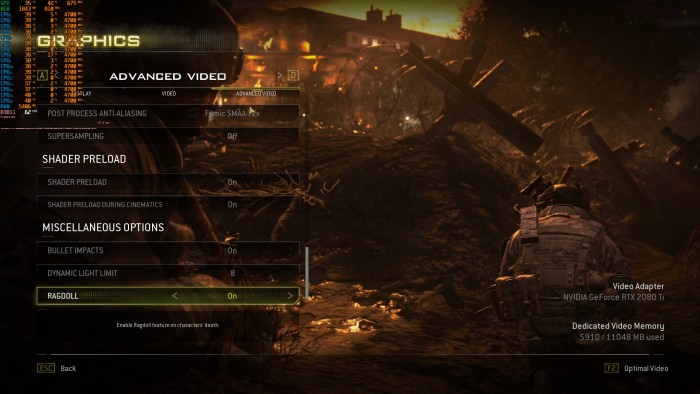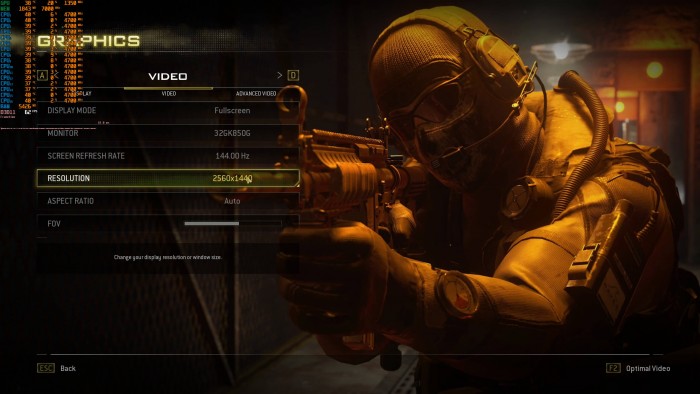 《使命召唤6:现代战争2 重制版》没有提供跑分工具,所以我们使用第一个任务场景作为参照,观察帧数表现。另外我们关闭了“填充剩余内存”的设定选项,否则会引起稳定性问题。