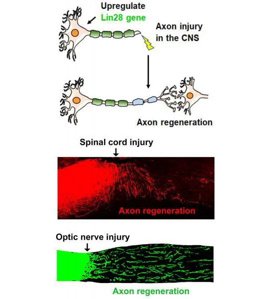 首先,研究小组对某些组织中过量表达Lin28的小鼠进行了工程化处理。当这些小鼠完全长大后,再给位于对照组的它们的脊髓或视神经(连接眼睛和大脑的视神经)发起损伤。在给另一组的实验对象同样的损伤后,给具有正常Lin28分泌的小鼠注射了该分子。