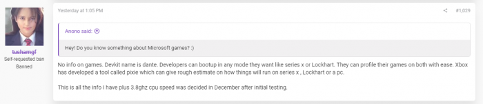 @tusharngf之后又透露了更多相关的情报。首先次世代Xbox开发机的代号为但丁(Dante),开发者可以在启动时随时切换模式(Xbox Series X或低配版Lockhart),微软还开发了一个名叫Pixie的工具,能够粗略的让开发者估计游戏在XSX、Lockhart或PC上的运行情况。