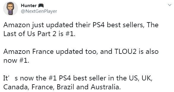 据国外网友透露,目前《最后生还者 第二章》仅在预购阶段就达到了多个地区Amazon游戏畅销榜第一的宝座,这些地区包含美国、英国、加拿大、法国、巴西和澳大利亚。