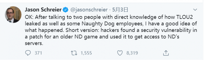 此外,据国外记着Jason Schreier称,泄露是黑客所为。他们利用补丁程序中的安全漏洞从加利福尼亚开发人员的服务器中获得了泄露出的旧版本视频。关于顽皮狗拖欠工资导致泄露的说法完全不正确,实际上因为疫情,顽皮狗已经为其员工提高了福利措施。