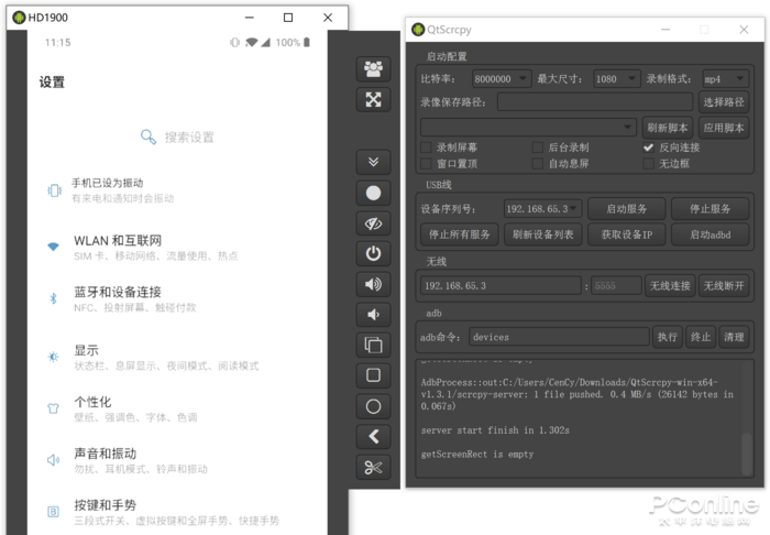 ·点击“启动服务”,QtScrcpy就会显示手机画面的小窗了,连接成功。