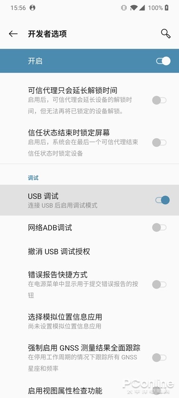 进入到开发者选项后,开启“USB调试”。之后,将手机和PC相连,Windows 10会自动安装相应驱动。