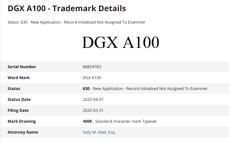 据商标查询网站Justia显示,NVIDIA已经在今年3月30日悄然注册了“DGX A100”,对应基于安培架构、GA100核心Tesla A100计算卡的新一代深度学习工作站、AI超级计算机。