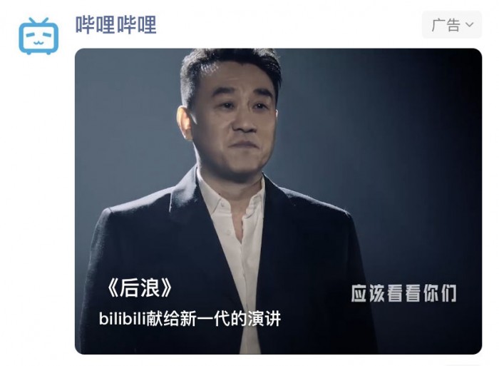 更显传播能力的,B 站在朋友圈投放的广告,引发了刷屏的热潮。有趣的是,这条“献给新一代”的演讲,在很多人看来,几乎大多是“上一代”在转发评论,B 站安身立命的“Z 世代”反而很少出现。
