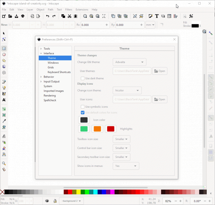 从菜单和工具栏到页面大小和自定义字体目录,都可以进行自定义。可以从已安装的主题中进行选择,为 Inkscape 提供深色或明亮的界面,然后在图标集中选择,其中包括可自定义的单色图标和新设计的多色图标集。用于将当前文件另存为模板的新对话框意味着可以使用所需的模板。