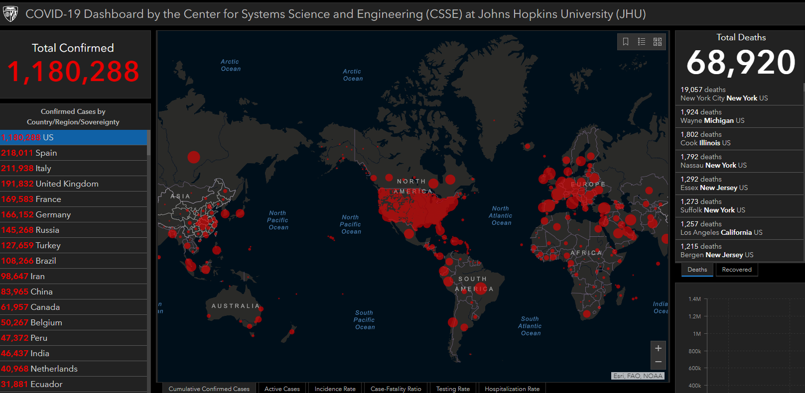上周末,数千人在加州聚集在一起,抗议当地的封锁令,随后有近三十多人在州议会大厦被捕。与此同时,来自约翰斯·霍普金斯大学的最新数据显示,迄今为止,美国已有近118万人感染了冠状病毒,近6.9万人死亡。