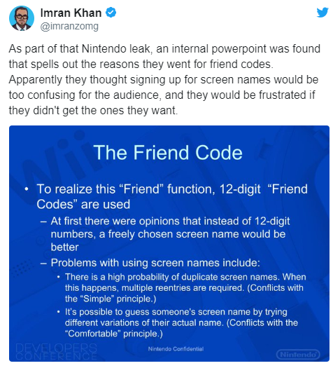 上周泄露的任天堂内部PPT解释了这个问题。在Wii时代,任天堂内部相信FC好友码使用起来要比用户名更加便捷、体验更好。在PPT中首先提到“一开始有人认为自由选择的用户名称会比12位数字更好”,但旋即就列出了任天堂认为的潜在问题。
