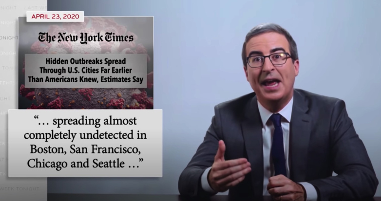 Oliver认为美国在这两点上基本上都失败了,他在《上周今夜秀》节目中谈及的主要内容是关于检测问题。报道中解释了美国新冠病毒应对初期出了什么,以及为什么检测被推迟等。他还介绍了影响COVID-19检测的后勤问题。此外,报告指出,另一种能够帮助医生了解疾病的真正范围的关键测试--免疫力测试,也存在着巨大的问题。它们大多不可靠,经常会返回假阳性结果。
